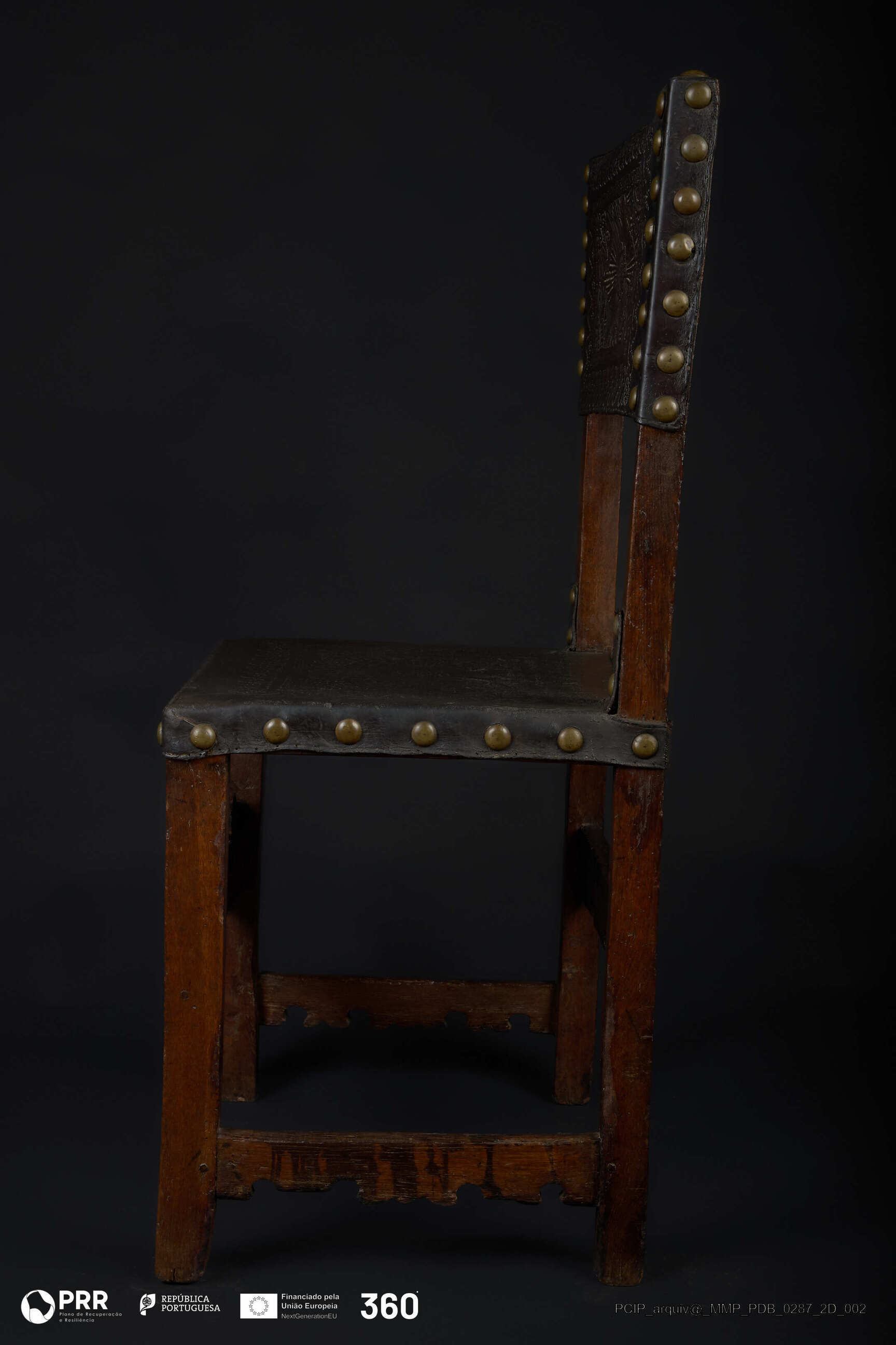 Matéria/Técnica: Couro e madeira; Cronologia: Século XVII; Autoria: Desconhecida; Dimensões (cm): Altura: 96; Largura: 49; Profundidade: 40,5.