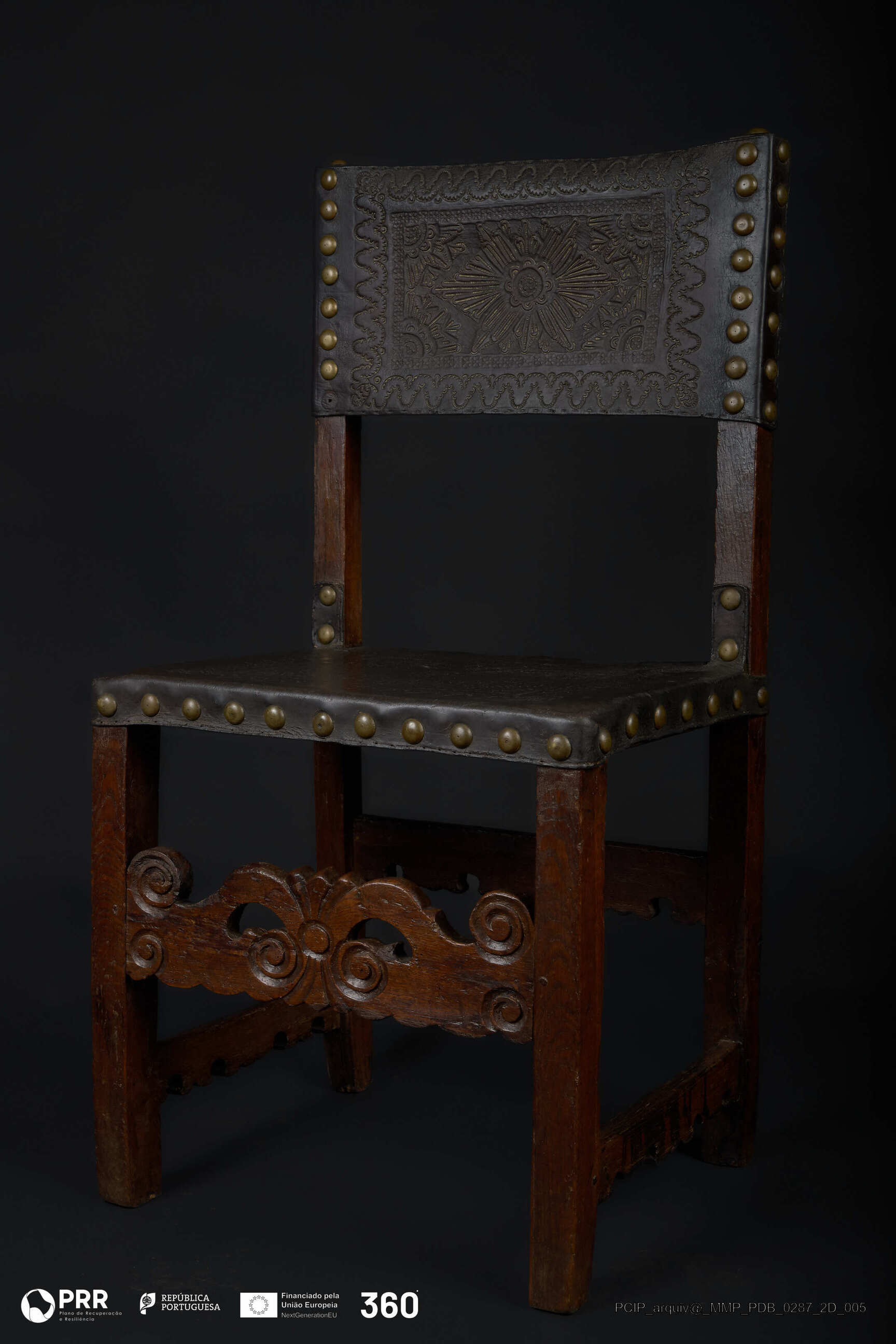 Matéria/Técnica: Couro e madeira; Cronologia: Século XVII; Autoria: Desconhecida; Dimensões (cm): Altura: 96; Largura: 49; Profundidade: 40,5.