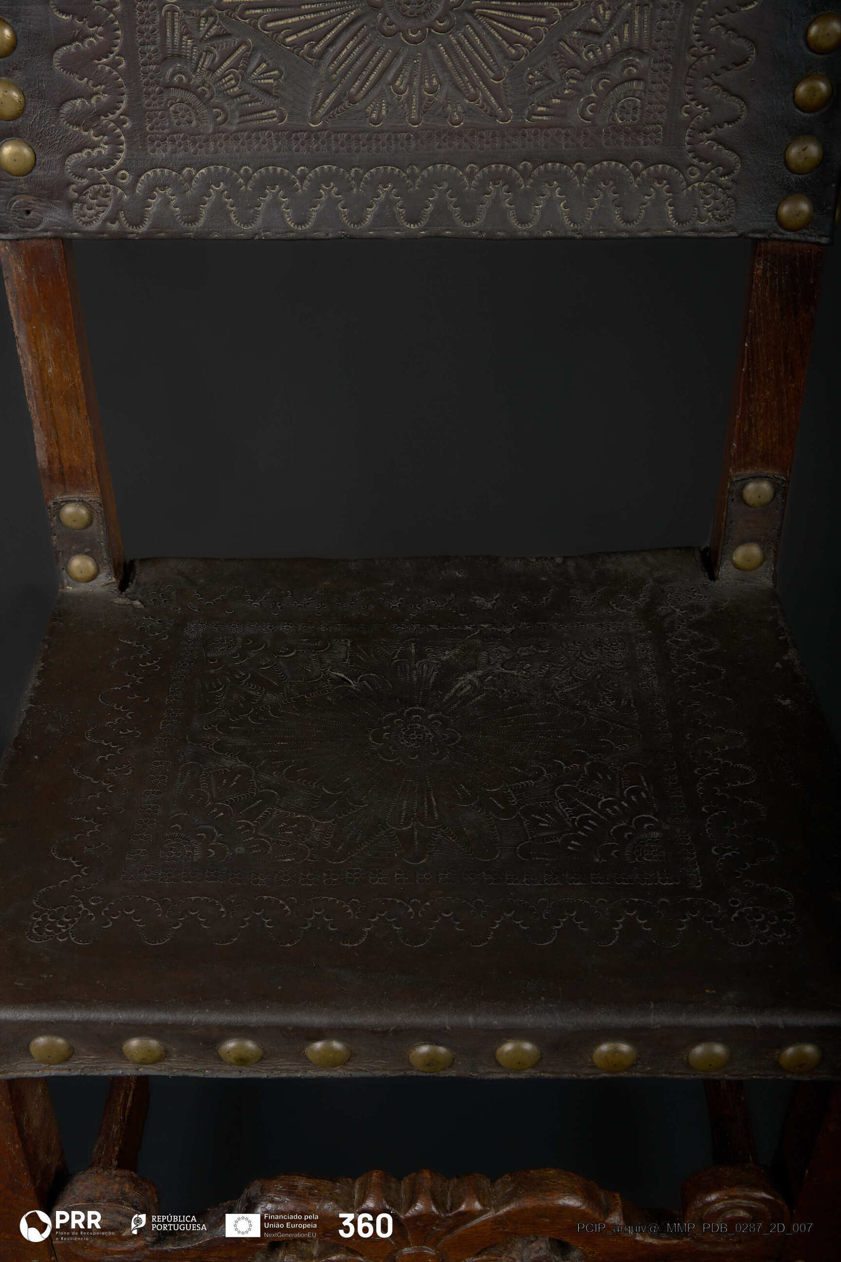 Matéria/Técnica: Couro e madeira; Cronologia: Século XVII; Autoria: Desconhecida; Dimensões (cm): Altura: 96; Largura: 49; Profundidade: 40,5.
