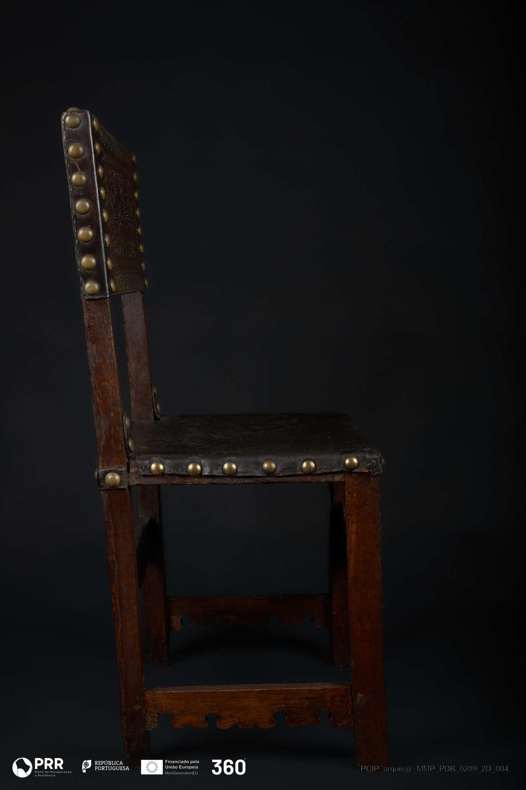 Matéria/Técnica: Couro e madeira; Cronologia: Século XVII; Autoria: Desconhecida; Dimensões (cm): Altura: 95,6; Largura: 49,5; Profundidade: 41.