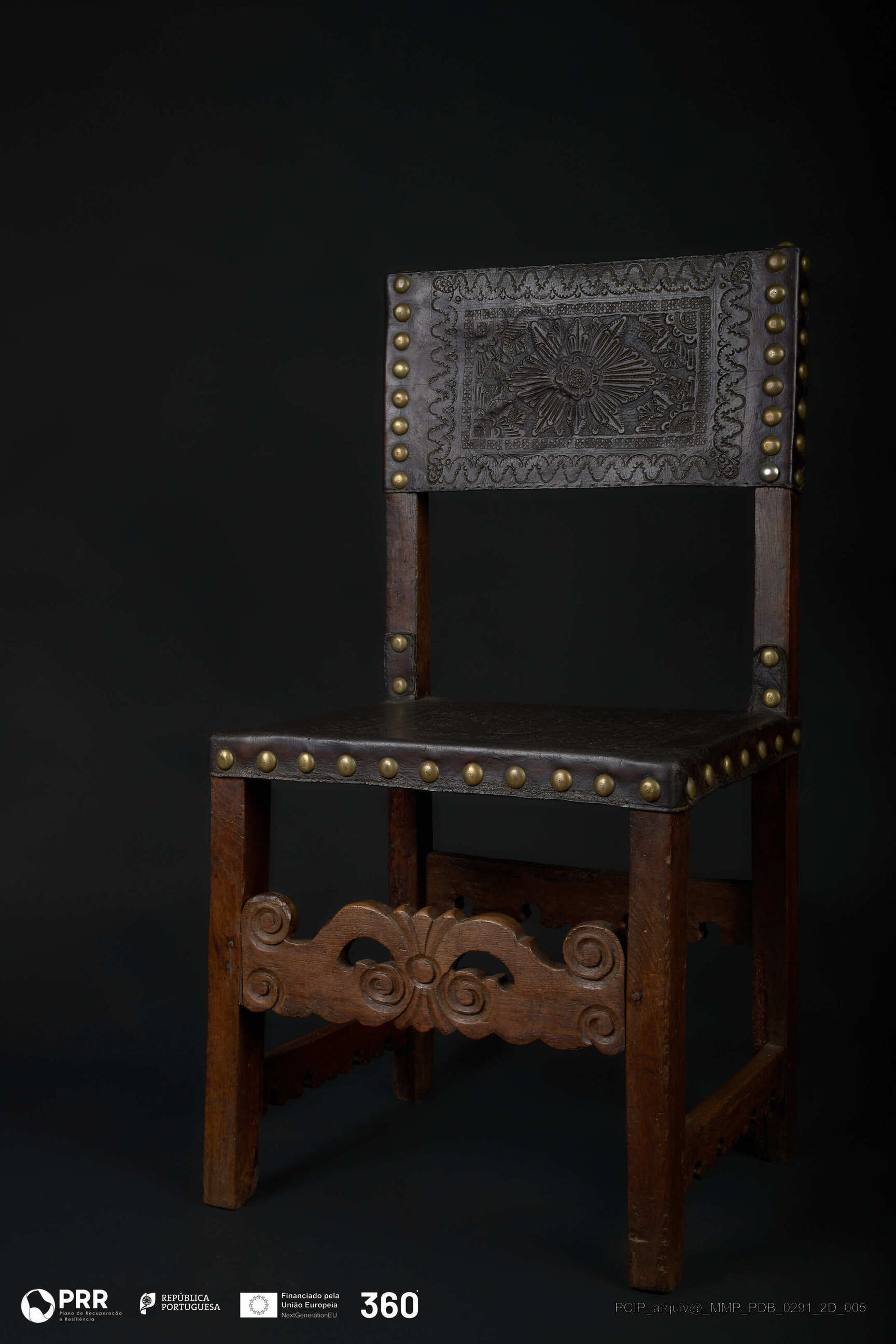 Matéria/Técnica: Couro e madeira; Cronologia: Século XVII; Autoria: Desconhecida; Dimensões (cm): Altura: 97; Largura: 49,5; Profundidade: 40,3.