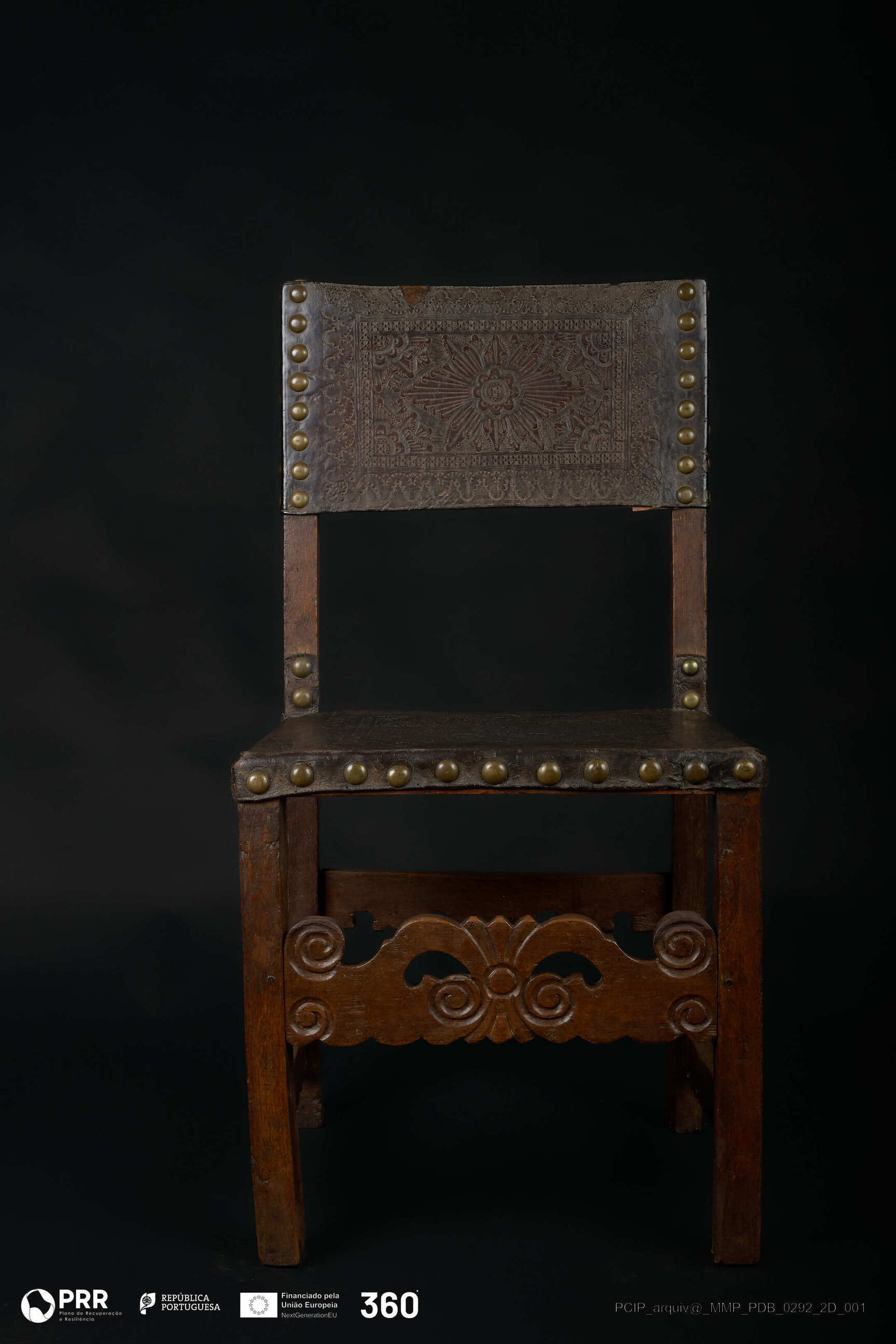 Matéria/Técnica: Couro e madeira; Cronologia: Século XVII; Autoria: Desconhecida; Dimensões (cm): Altura: 96,2; Largura: 50; Profundidade: 41,5.