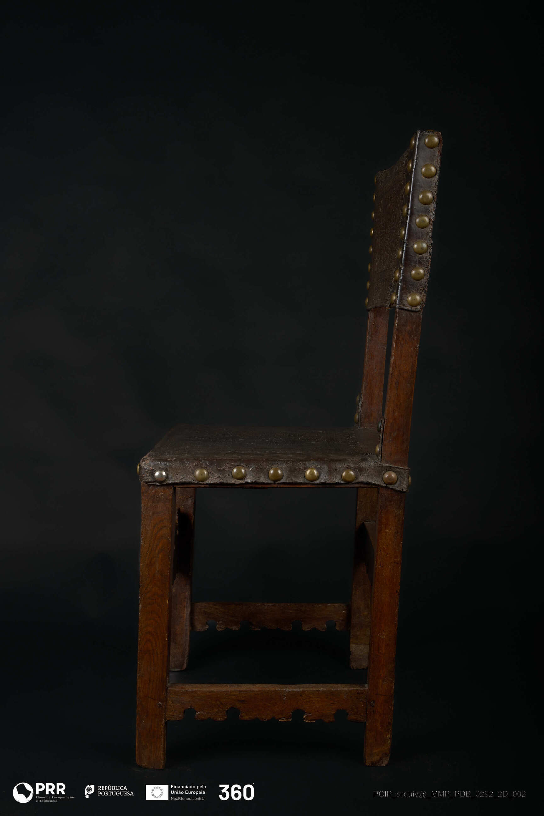 Matéria/Técnica: Couro e madeira; Cronologia: Século XVII; Autoria: Desconhecida; Dimensões (cm): Altura: 96,2; Largura: 50; Profundidade: 41,5.