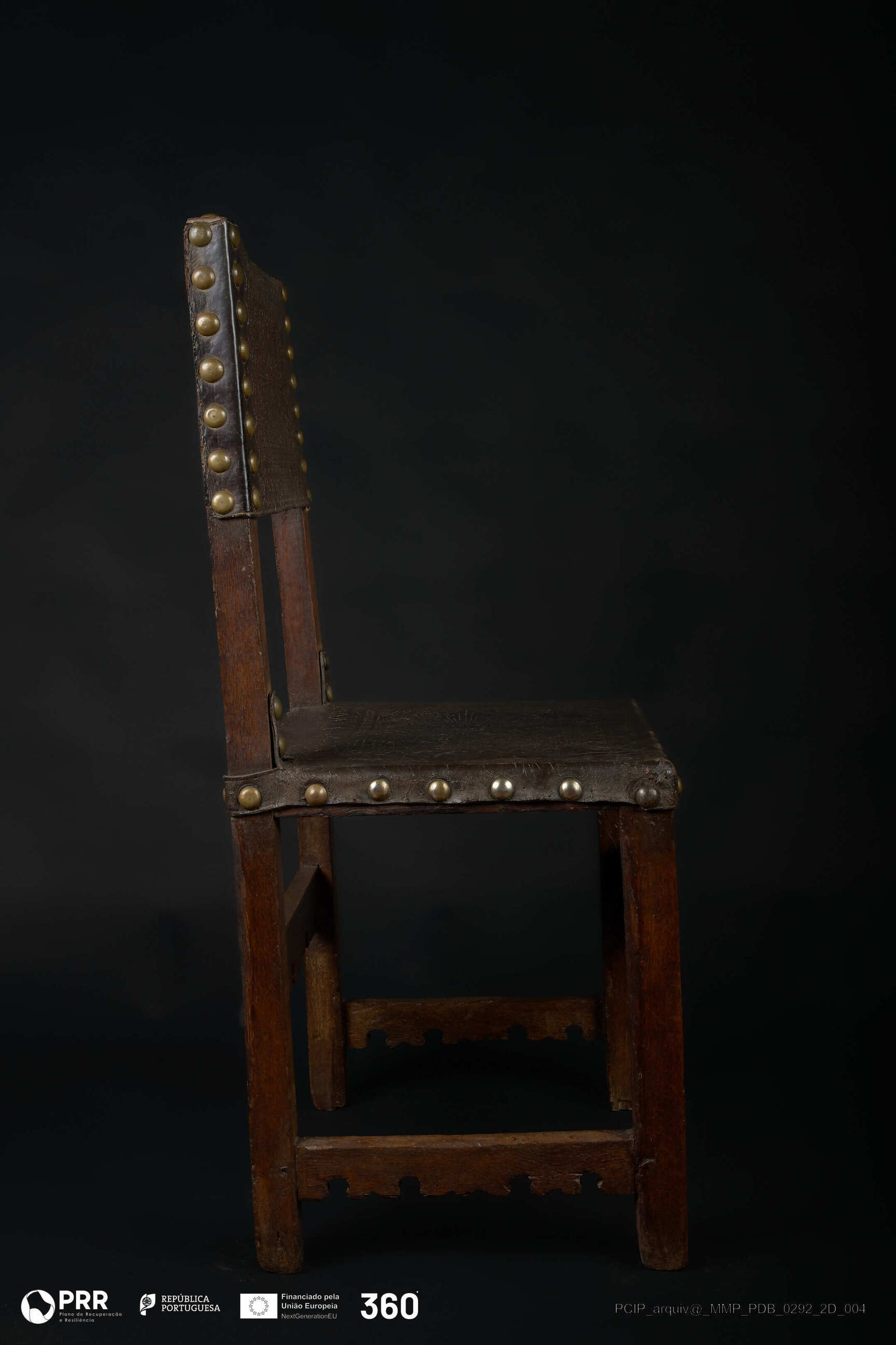 Matéria/Técnica: Couro e madeira; Cronologia: Século XVII; Autoria: Desconhecida; Dimensões (cm): Altura: 96,2; Largura: 50; Profundidade: 41,5.