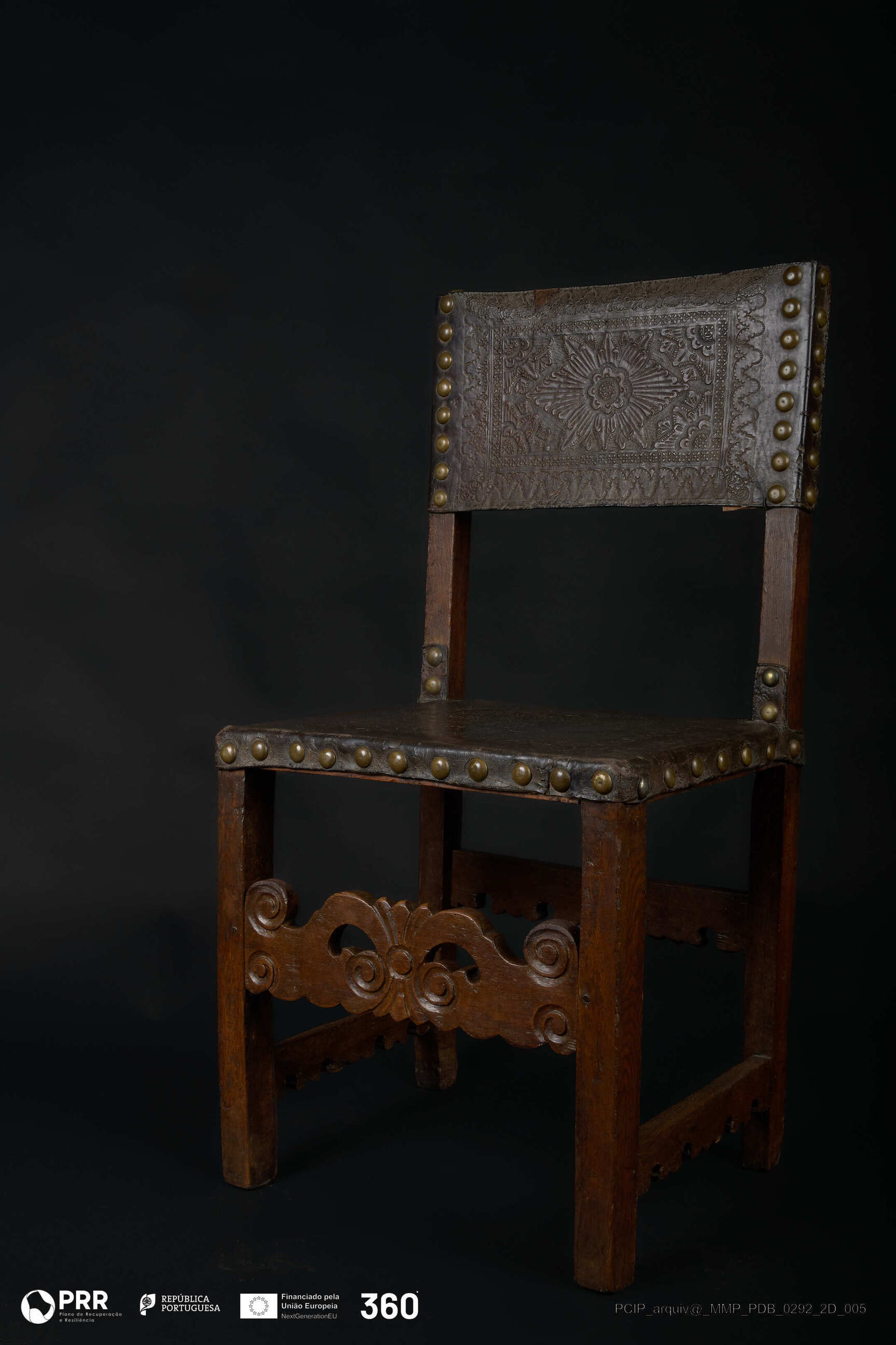 Matéria/Técnica: Couro e madeira; Cronologia: Século XVII; Autoria: Desconhecida; Dimensões (cm): Altura: 96,2; Largura: 50; Profundidade: 41,5.