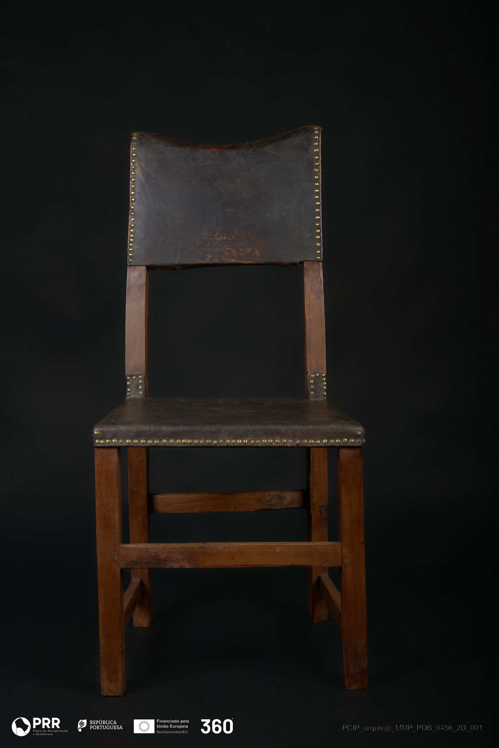 Matéria/Técnica: Couro e madeira; Cronologia: Século XVII; Autoria: Desconhecida; Dimensões (cm): Altura: 101; Largura: 46,3; Profundidade: 42,8.