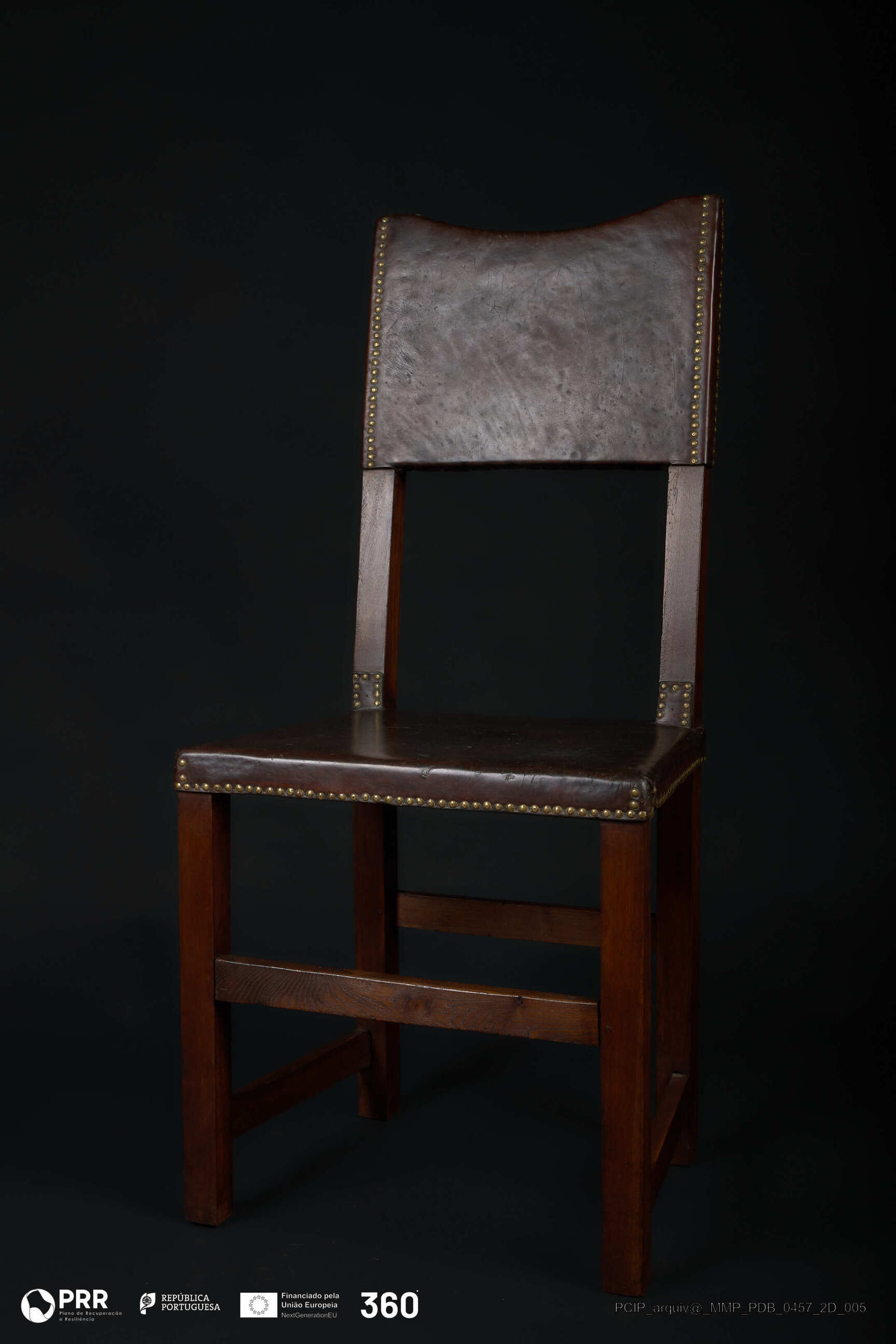 Matéria/Técnica: Couro e madeira; Cronologia: Século XVII; Autoria: Desconhecida; Dimensões (cm): Altura: 101,5; Largura: 46,2; Profundidade: 40,5.