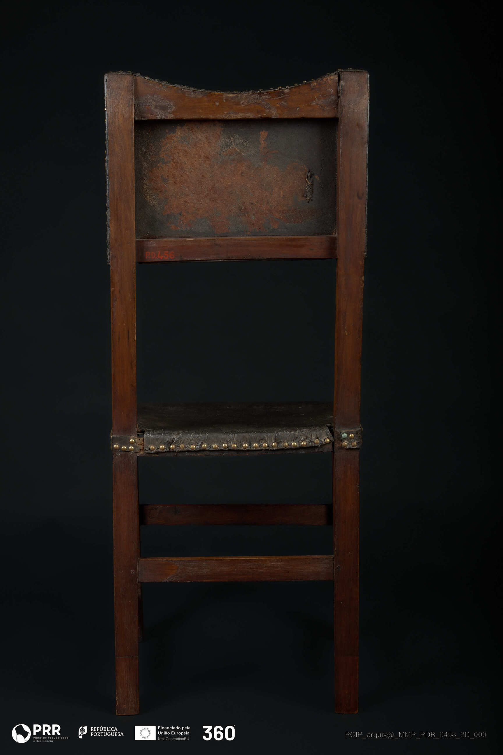 Matéria/Técnica: Couro e madeira; Cronologia: Século XVII; Autoria: Desconhecida; Dimensões (cm): Altura: 99,8; Largura: 45,2; Profundidade: 44.