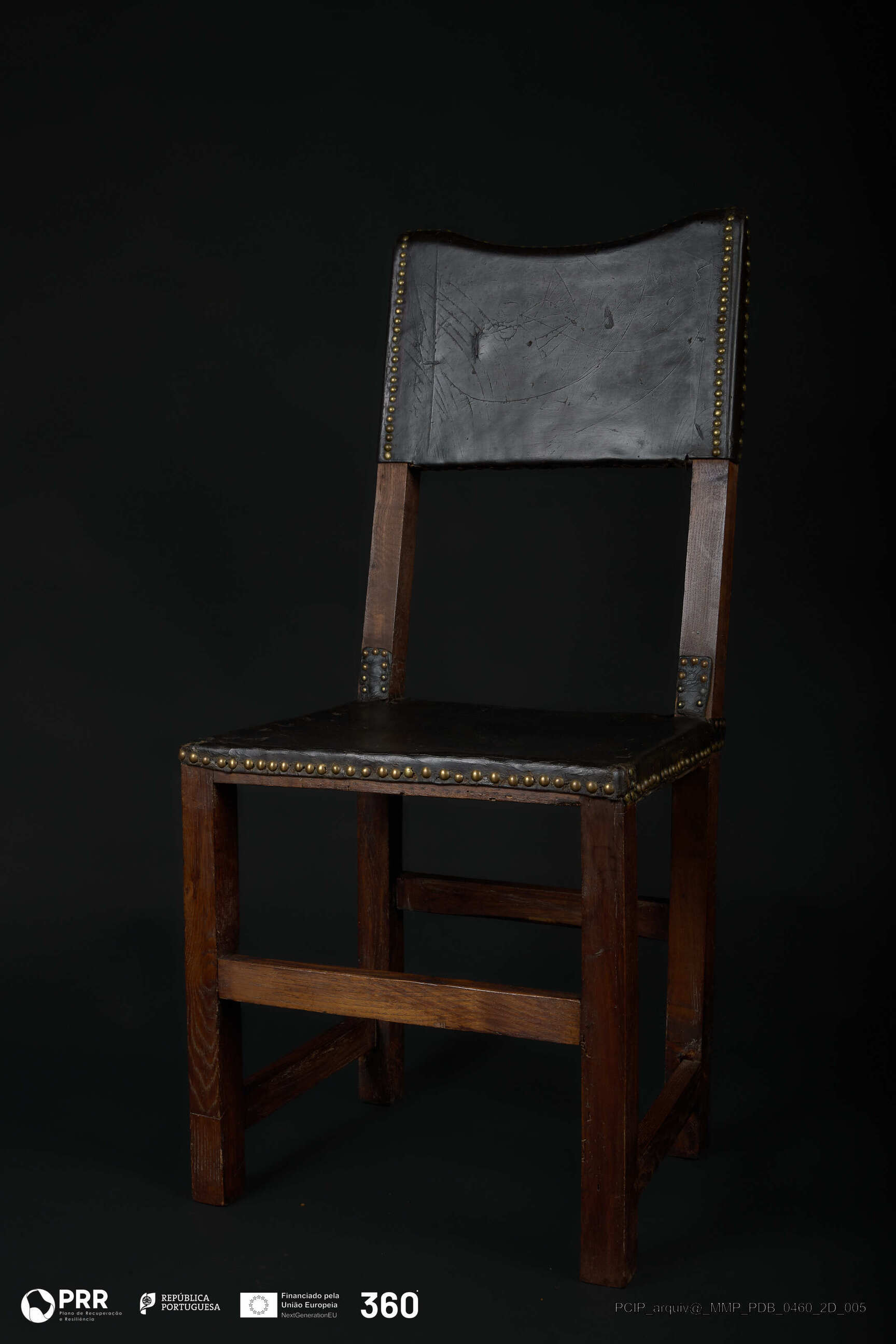 Matéria/Técnica: Couro e madeira; Cronologia: Século XVII; Autoria: Desconhecida; Dimensões (cm): Altura: 100,7; Largura: 47; Profundidade: 42,5.