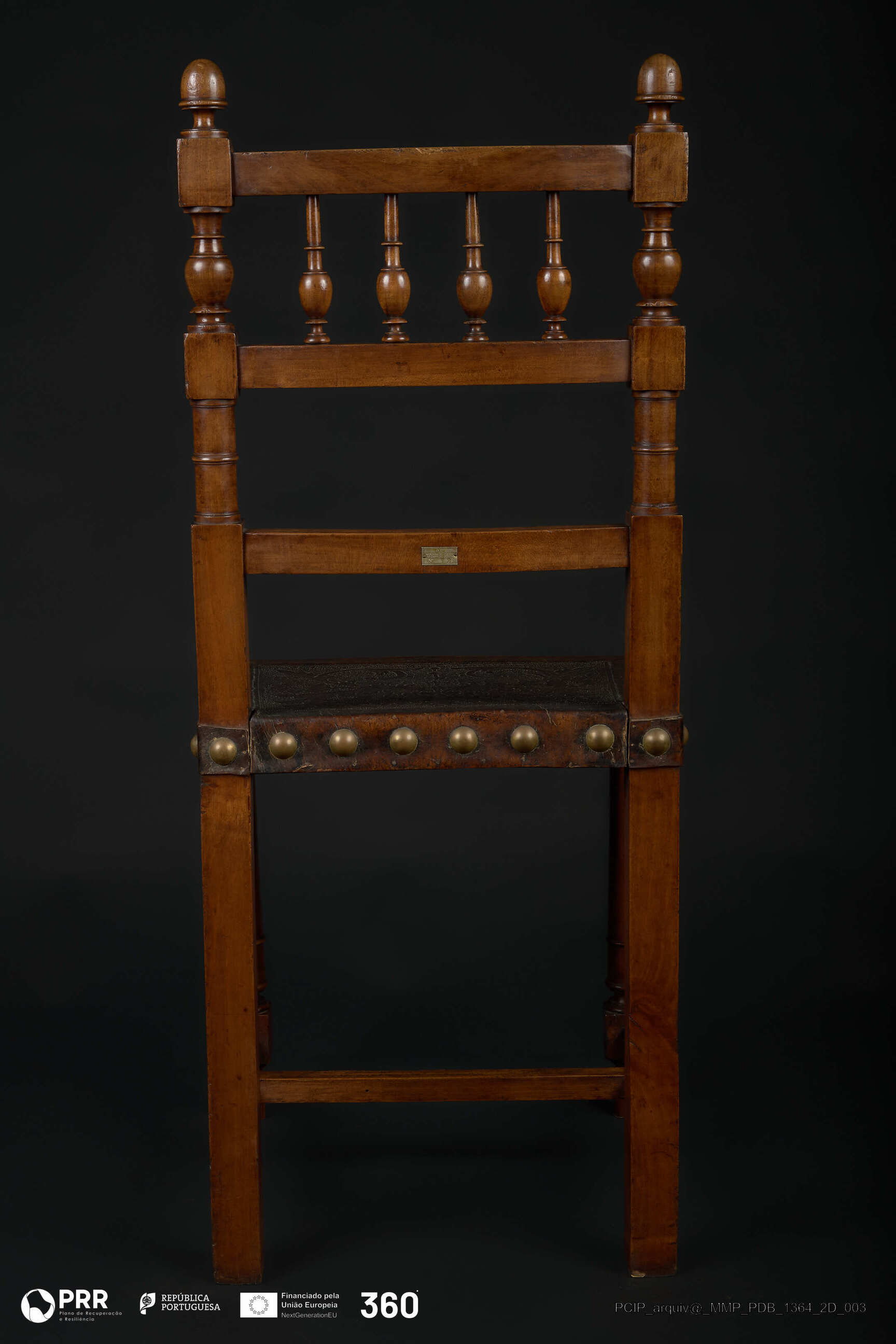 Matéria/Técnica: Couro e madeira; Cronologia: Século XIX; Autoria: Desconhecida; Dimensões (cm): Altura: 94,5; Largura: 42; Profundidade: 47.