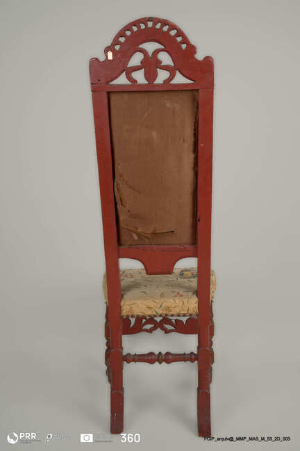 Matéria/Técnica: Madeira entalhada, torneada e policromada ( pintura acharoada ); seda bordada a sedas polícromas; Cronologia: Século XVIII; Autoria: Desconhecida; Dimensões (cm): Altura: 137; Largura: 65; Comprimento: 50,5.