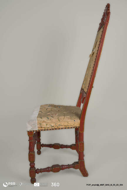 Matéria/Técnica: Madeira entalhada, torneada e policromada ( pintura acharoada ); seda bordada a sedas polícromas; Cronologia: Século XVIII; Autoria: Desconhecida; Dimensões (cm): Altura: 137; Largura: 65; Comprimento: 50,5.