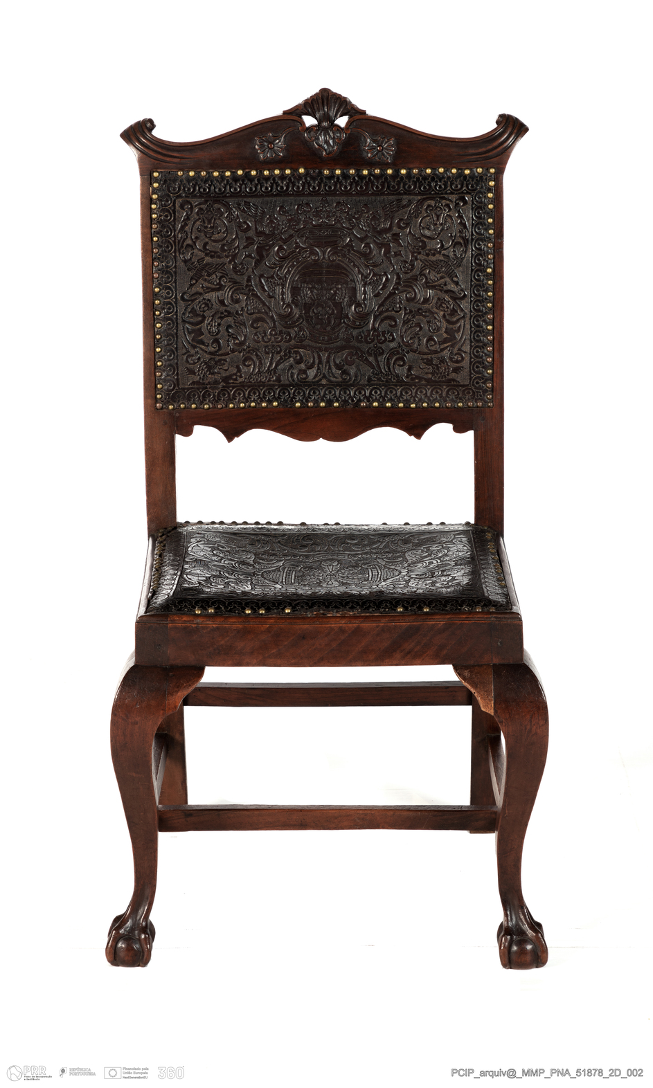 Matéria/Técnica: Madeira de (?); couro; pregaria miuda de metal amarelo; Cronologia: Século XIX; Autoria: Desconhecida; Dimensões (cm): Altura: 100; Largura: 53,0; Profundidade: 45,0.