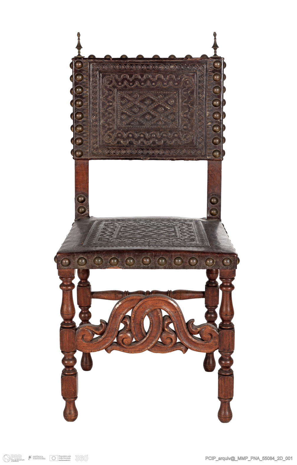 Matéria/Técnica: Madeira de (?); couro; metal amarelo; Cronologia: Século XVII; Autoria: Desconhecida; Dimensões (cm): Altura: 96; Largura: 45; Profundidade: 42.