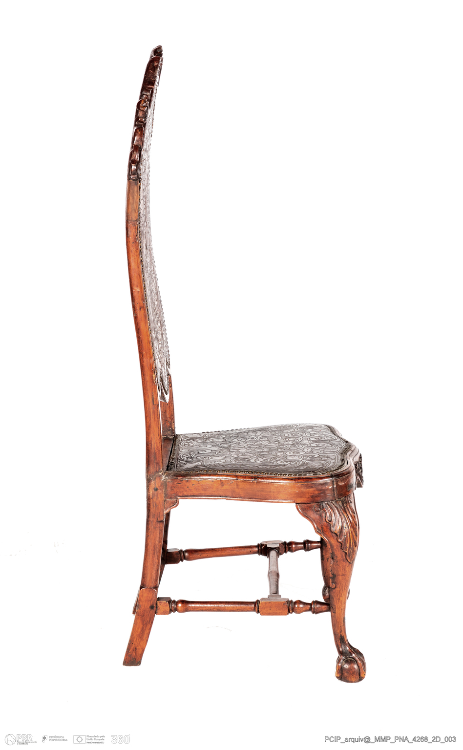 Matéria/Técnica: Madeira de nogueira; couro; pregaria de metal amarelo; Cronologia: 1706 - 1750; Autoria: Desconhecida; Dimensões (cm): Altura: 135,5; Largura: 57,5; Profundidade: 55,5.
