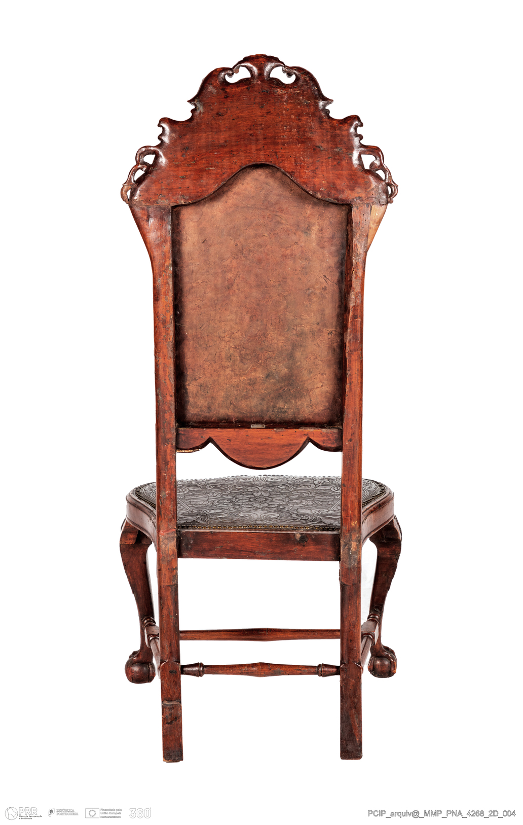 Matéria/Técnica: Madeira de nogueira; couro; pregaria de metal amarelo; Cronologia: 1706 - 1750; Autoria: Desconhecida; Dimensões (cm): Altura: 135,5; Largura: 57,5; Profundidade: 55,5.
