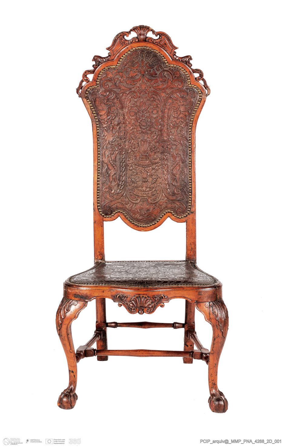 Matéria/Técnica: Madeira de nogueira; couro; pregaria de metal amarelo; Cronologia: 1706 - 1750; Autoria: Desconhecida; Dimensões: Altura: 135,5; Largura: 57,5; Profundidade: 55,5.