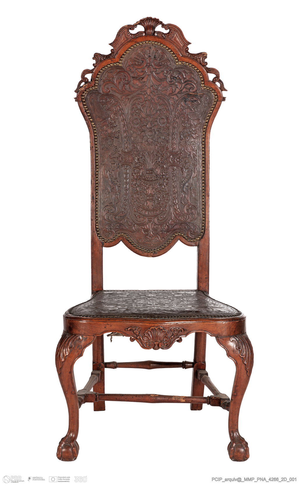 Matéria/Técnica: Madeira de nogueira; couro; pregaria de metal amarelo; Cronologia: 1706 - 1750; Autoria: Desconhecida; Dimensões (cm): Altura: 135,5; Largura: 57,5; Profundidade: 55,5.