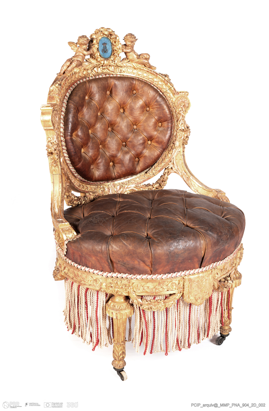 Matéria/Técnica: Madeira de faia (?); preparação branca; bolús vermelho; folha metálica de ouro de lei; metal; cabedal; 2777620; crina e pedra; Cronologia: 1852 - 1870; Autoria: Desconhecida; Dimensões (cm): Altura: 101; Largura: 64,0; Profundidade: 58,0.