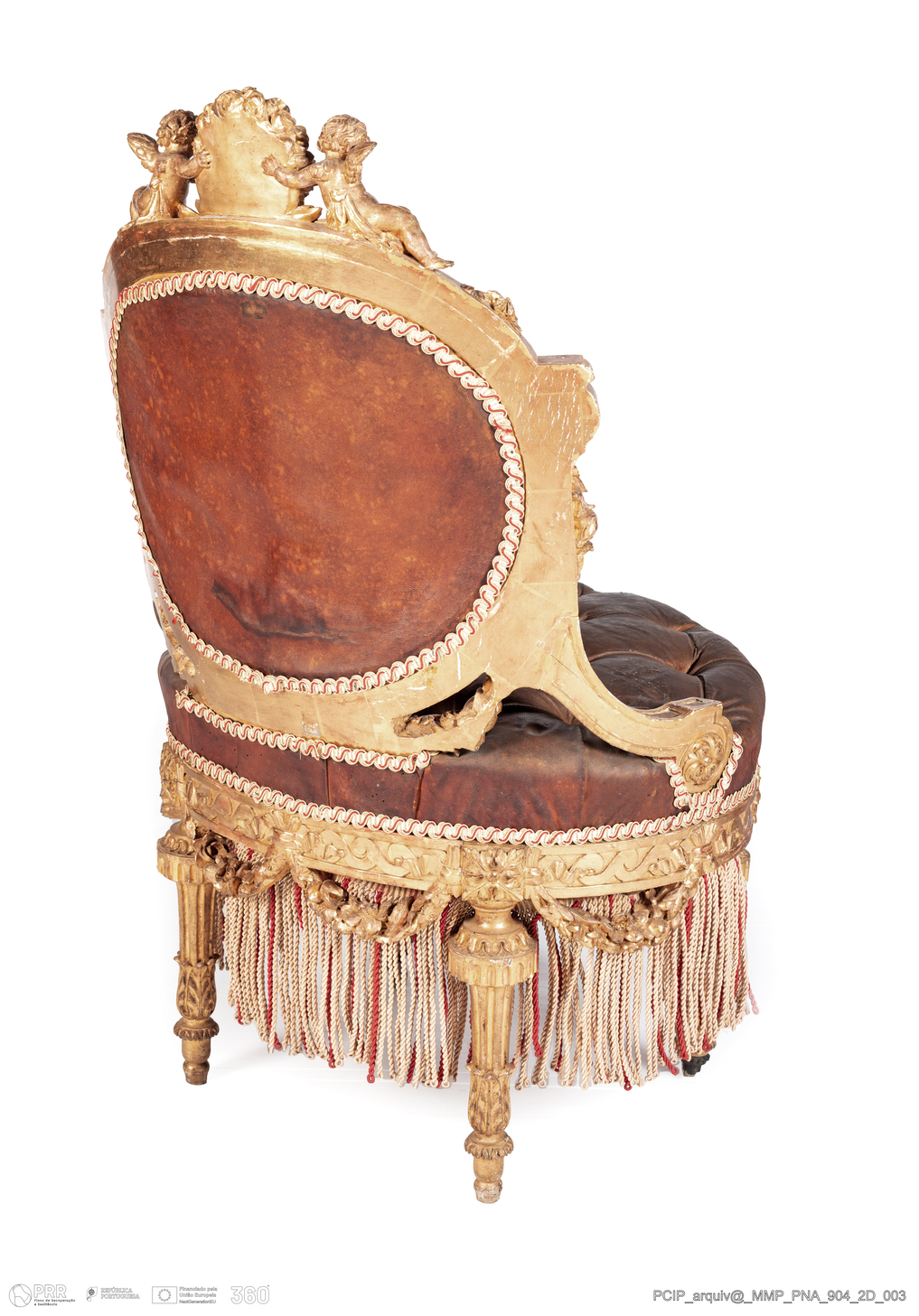 Matéria/Técnica: Madeira de faia (?); preparação branca; bolús vermelho; folha metálica de ouro de lei; metal; cabedal; 2777620; crina e pedra; Cronologia: 1852 - 1870; Autoria: Desconhecida; Dimensões (cm): Altura: 101; Largura: 64,0; Profundidade: 58,0.