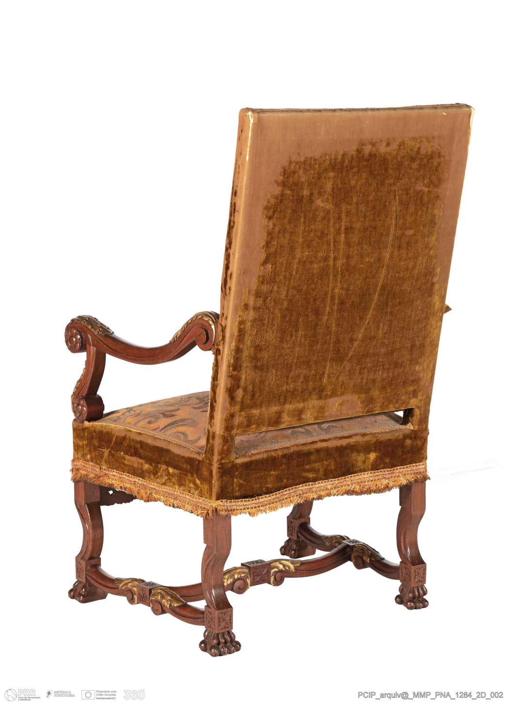 Matéria/Técnica: Madeira de (?); veludo de seda estampado; galão de seda com franjas; folha de ouro; Cronologia: 1830 - 1852; Autoria: Desconhecida; Dimensões (cm): Altura: 109; Largura: 66; Profundidade: 66.