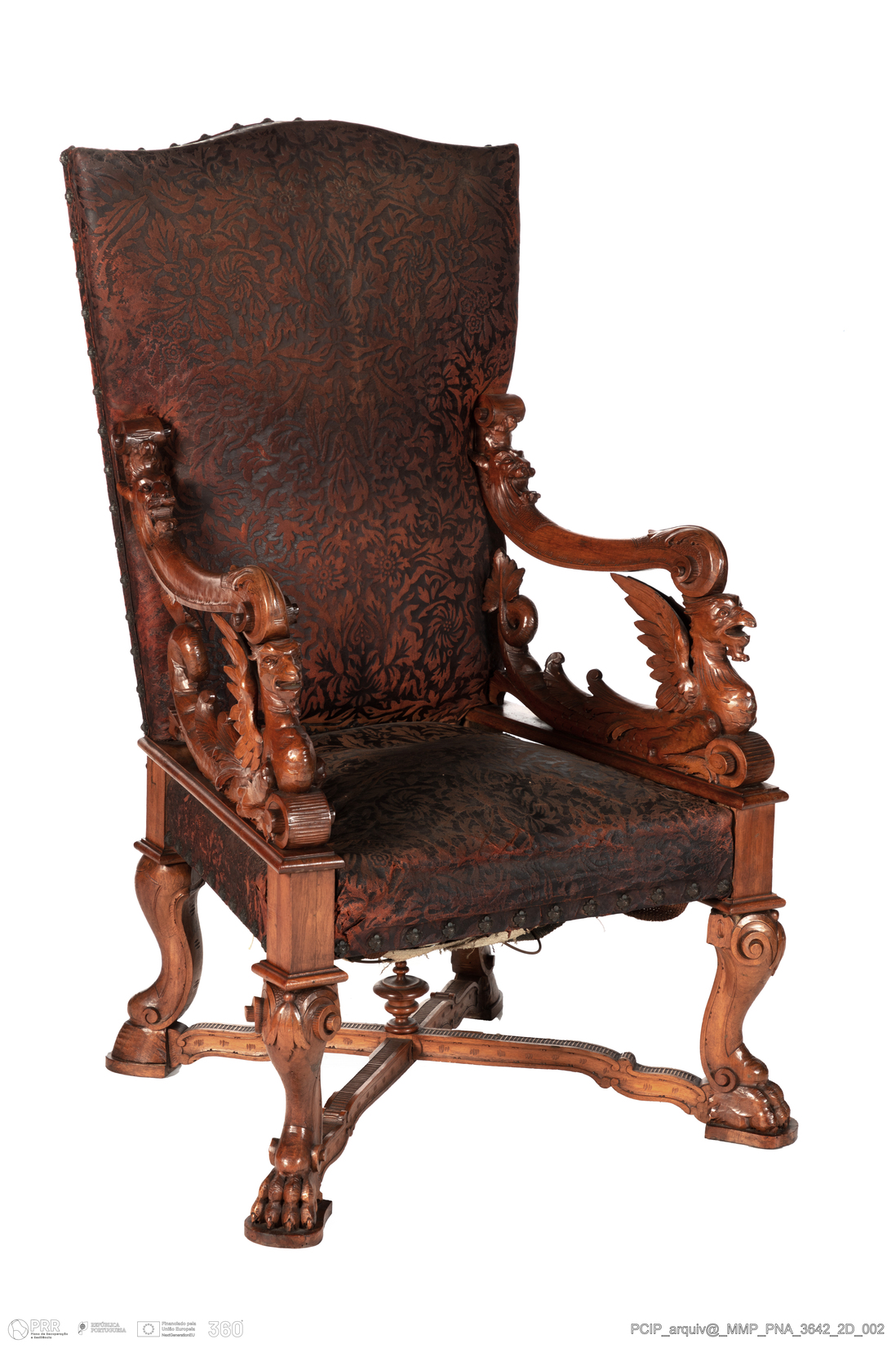 Matéria/Técnica: Madeira de nogueira; couro; galão de (?); pregaria metálica (latão?); Cronologia: Desconhecida; Autoria: Desconhecida; Dimensões (cm): Altura: 127,5; Largura: 93,5; Profundidade: 74,0.