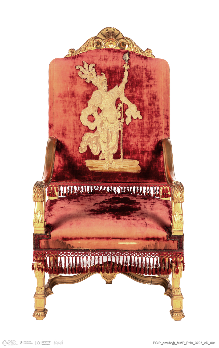 Matéria/Técnica: Madeira de (?); veludo de seda; folha de ouro; Cronologia: 1830 - 1852; Autoria: Desconhecida; Dimensões (cm): Altura: 125,0; Largura: 66,0; Profundidade: 62,0.