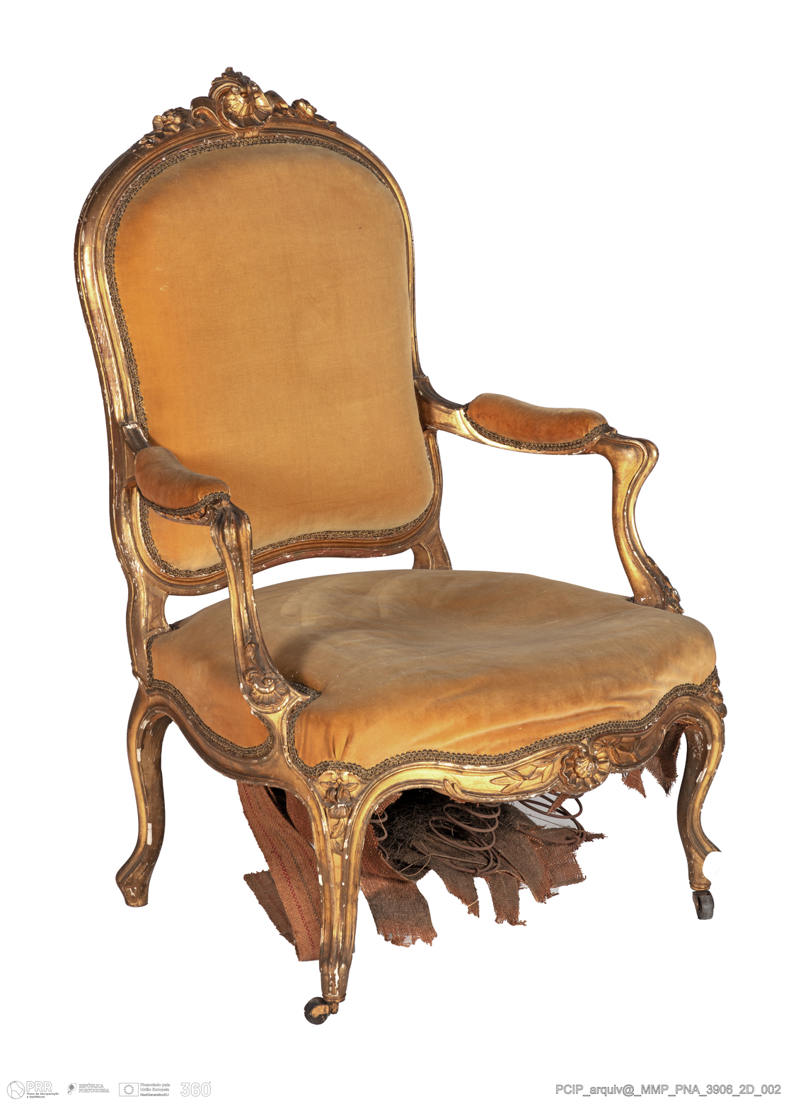 Matéria/Técnica: Madeira de (?); veludo; galão em fio de ouro; folha de ouro; rodízios; Cronologia: Século XIX; Autoria: Desconhecida; Dimensões (cm): Altura: 108,0; Largura: 74,0; Profundidade: 65,0.