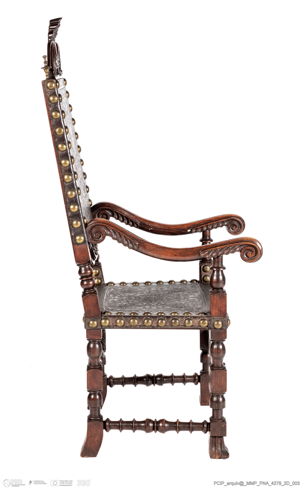 Matéria/Técnica: Madeira de (?); couro; pregaria metálica-calote esférica- e pináculos em liga de cobre (latão?); Cronologia: 1701 - 1750; Autoria: Desconhecida; Dimensões (cm): Altura: 145,0; Largura: 63,0; Profundidade: 53,5.