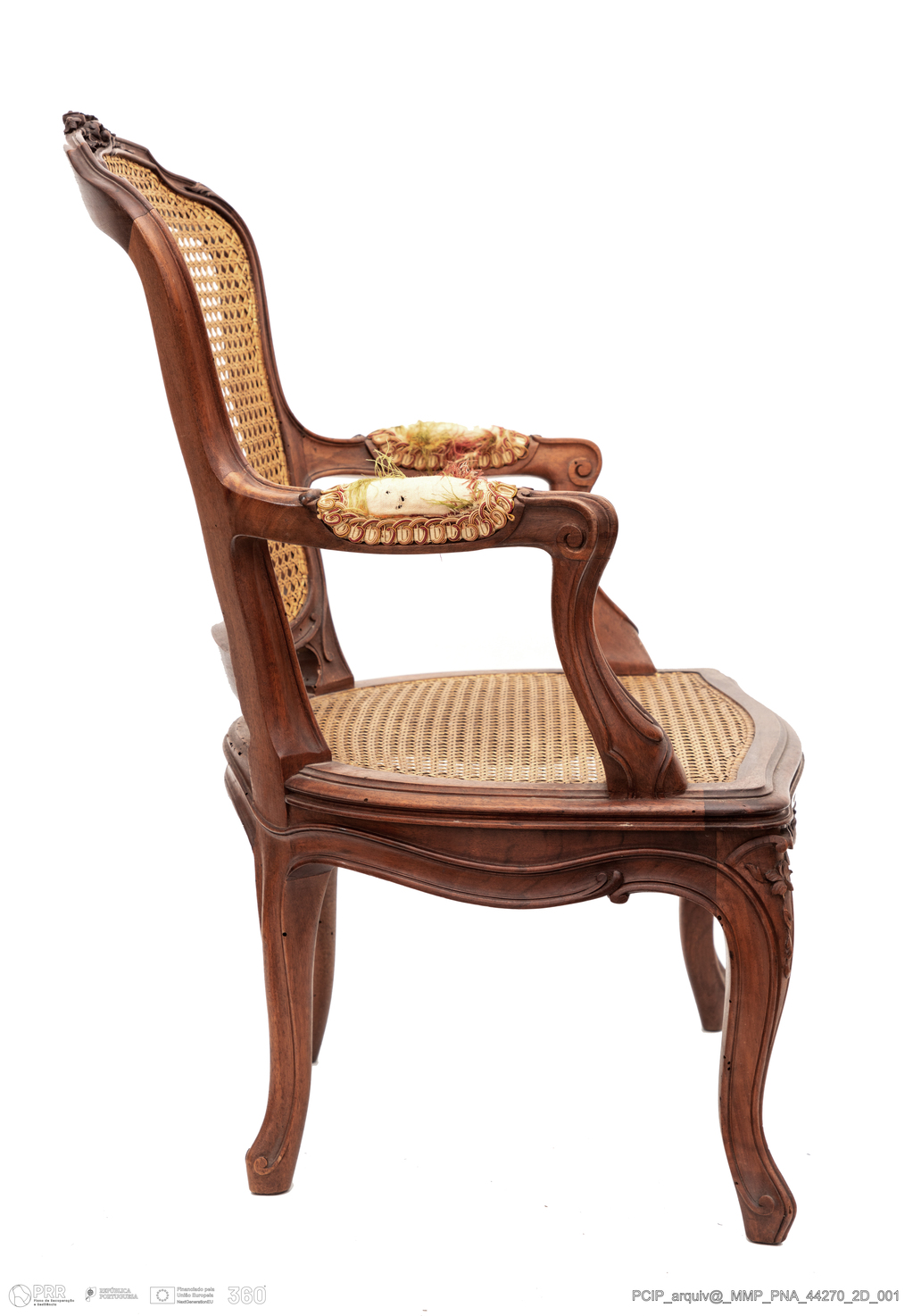 Matéria/Técnica: Madeira de nogueira; vime; tecido de seda; Cronologia: Século XIX; Autoria: Desconhecida; Dimensões (cm): Altura: 62; Largura: 42; Comprimento: 35.