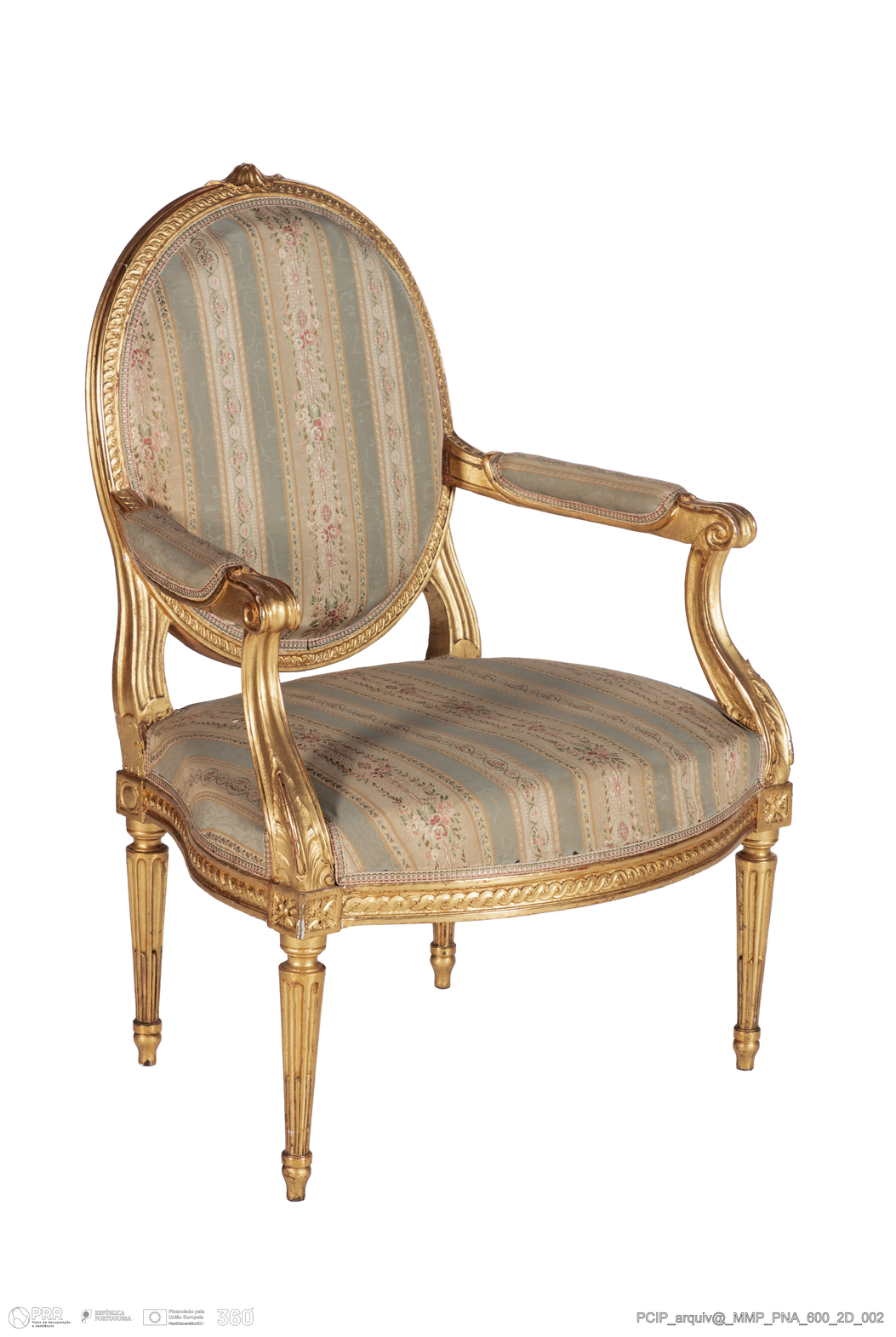 Matéria/Técnica: Madeira de (?); seda; cordão de seda; folha de ouro; Cronologia: 1729 - 1795; Autoria: Jean-Baptiste Lebas; Dimensões (cm): Altura: 95,0; Largura: 67,0; Profundidade: 55,5.