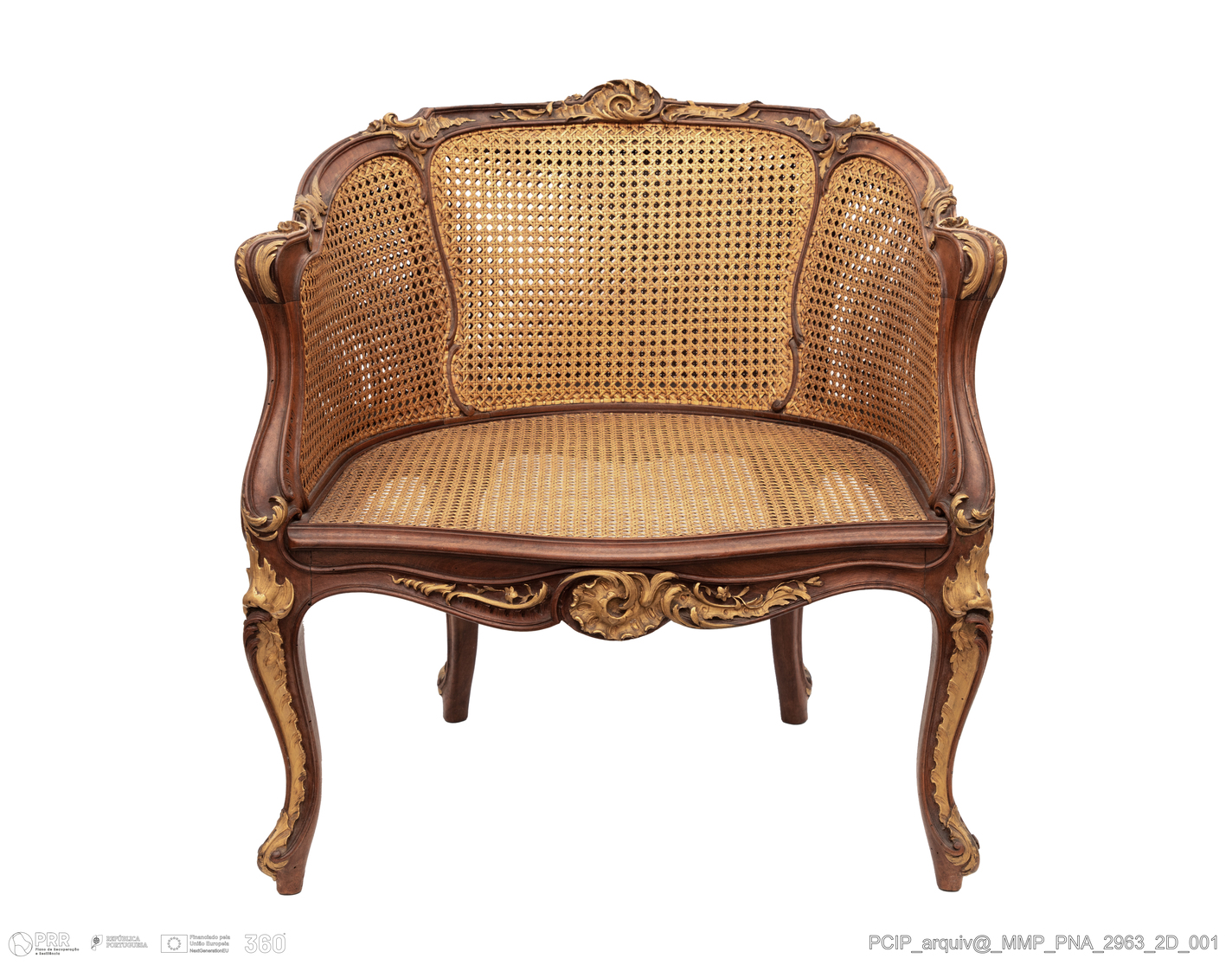 Matéria/Técnica: Madeira de nogueira; vime; Cronologia: Século XIX; Autoria: Desconhecida; Dimensões (cm): Altura: 56; Largura: 54; Comprimento: 48.
