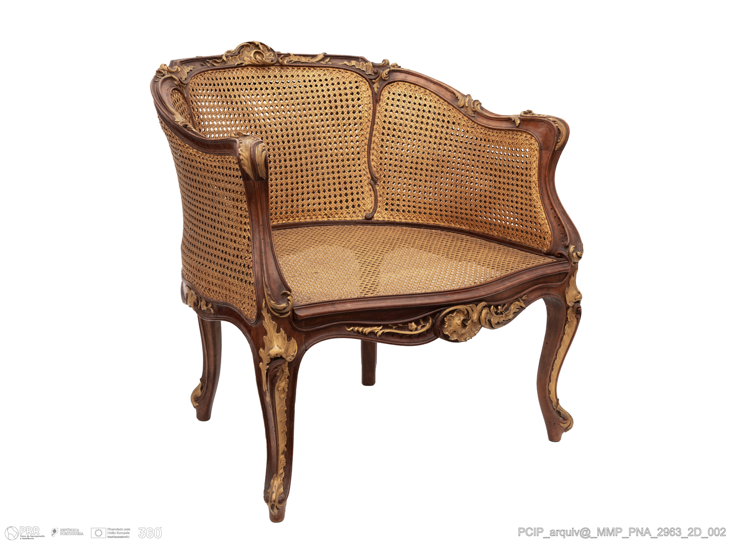 Matéria/Técnica: Madeira de nogueira; vime; Cronologia: Século XIX; Autoria: Desconhecida; Dimensões (cm): Altura: 56; Largura: 54; Comprimento: 48.