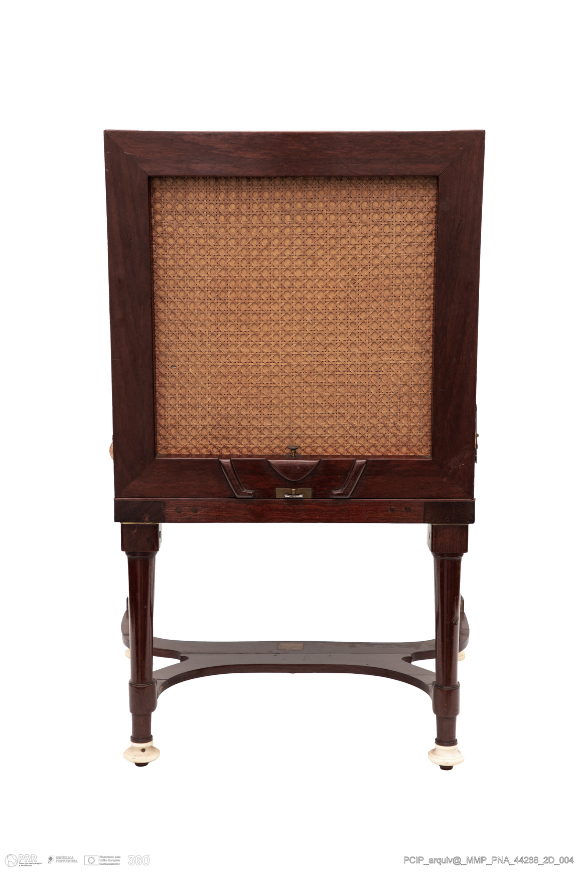 Matéria/Técnica: Madeira; vime; tecido de seda; metal; marfim; Cronologia: Século XIX; Autoria: Desconhecida; Dimensões (cm): Altura: 59; Largura: 40; Comprimento: 35.