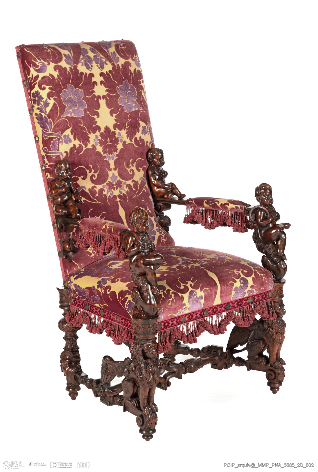 Matéria/Técnica: Madeira de nogueira (?); veludo de Génova; galão de seda; pregaria de metal; Cronologia: 1850 - 1900; Autoria: Desconhecida; Dimensões (cm): Altura: 137,5; Largura: 77; Profundidade: 67.