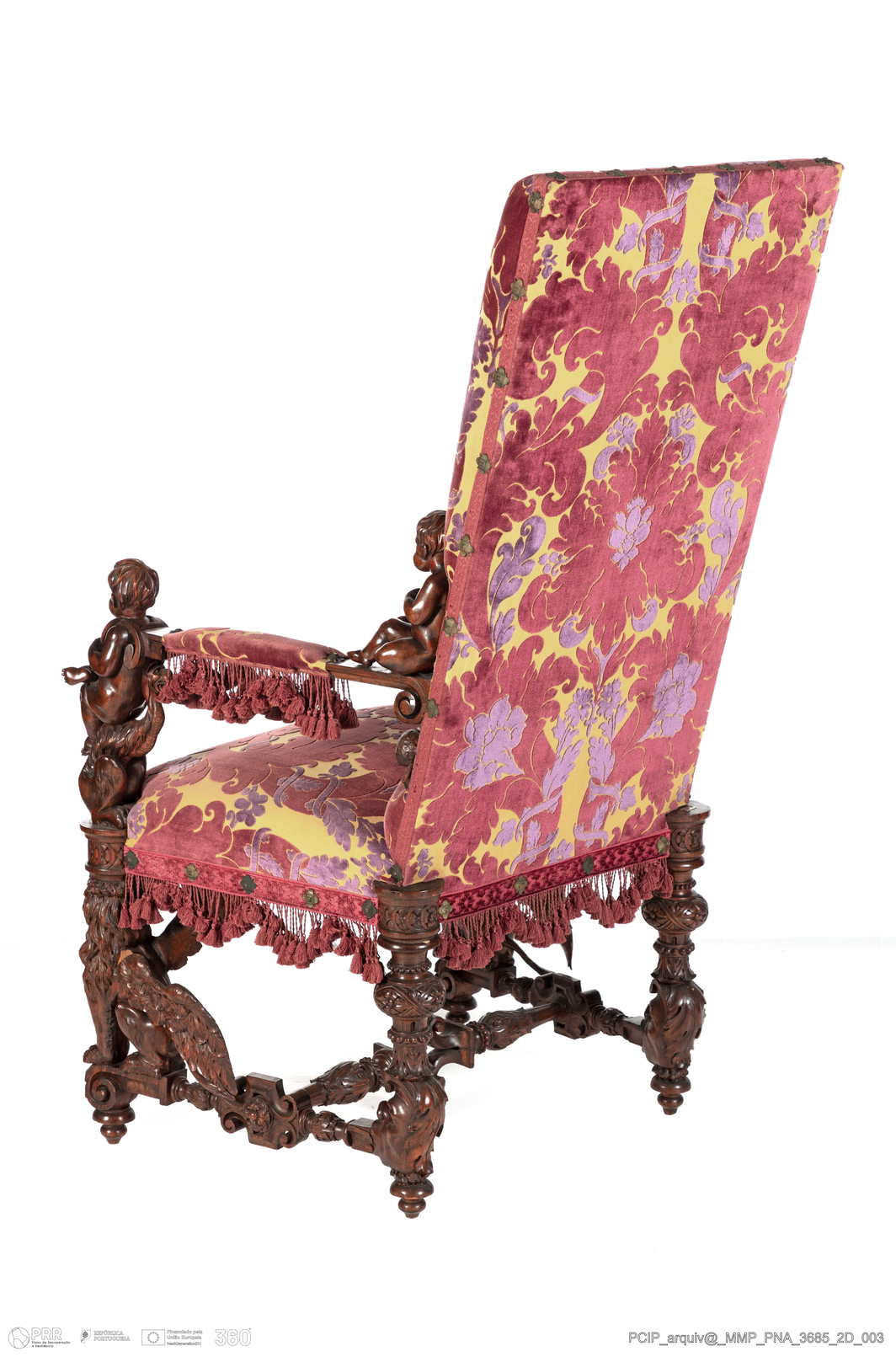 Matéria/Técnica: Madeira de nogueira (?); veludo de Génova; galão de seda; pregaria de metal; Cronologia: 1850 - 1900; Autoria: Desconhecida; Dimensões (cm): Altura: 137,5; Largura: 77; Profundidade: 67.