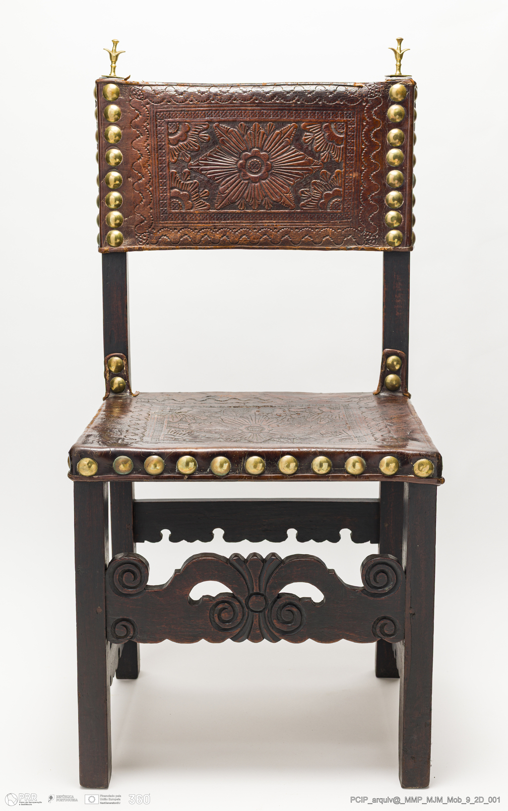 Matéria/Técnica: Couro e pregaria amarela; Cronologia: Desconhecida; Autoria: Desconhecida; Dimensões: 180 x 80 cm.