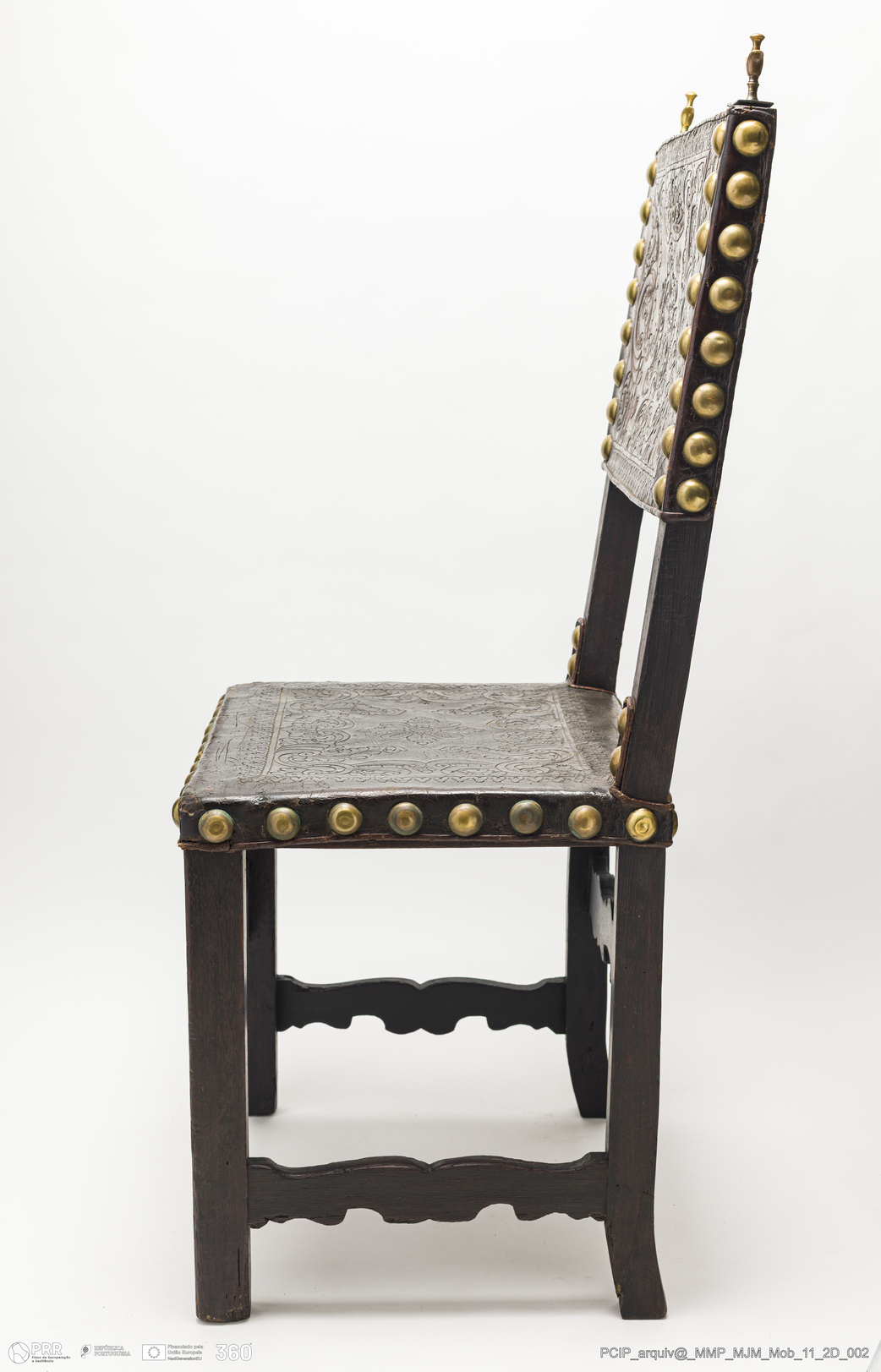 Matéria/Técnica: Couro e pregaria amarela; Cronologia: Desconhecida; Autoria: Desconhecida; Dimensões: Altura: 103 cm.