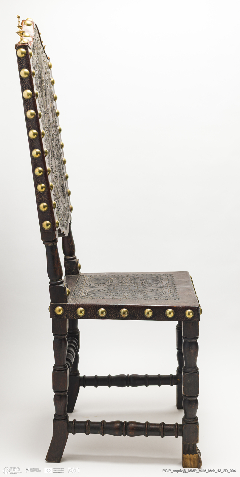 Matéria/Técnica: Couro e pregaria amarela; Cronologia: Desconhecida; Autoria: Desconhecida; Dimensões: Altura:128 cm.
