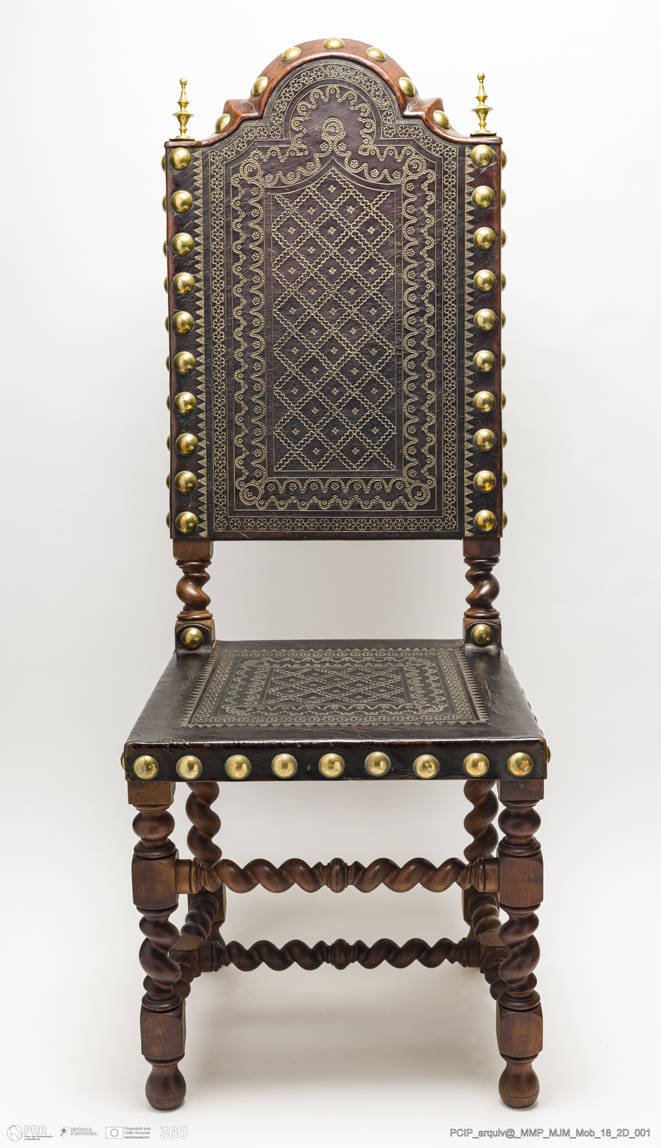 Matéria/Técnica: Couro e pregaria amarela; Cronologia: Desconhecida; Autoria: Desconhecida; Dimensões: Altura:128 cm.