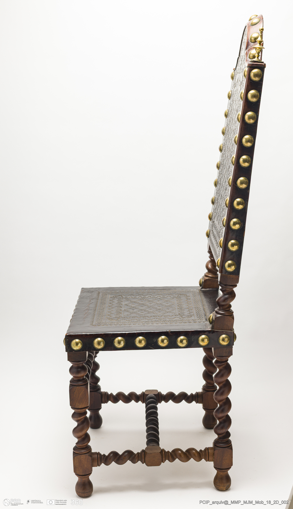 Matéria/Técnica: Couro e pregaria amarela; Cronologia: Desconhecida; Autoria: Desconhecida; Dimensões: Altura:128 cm.