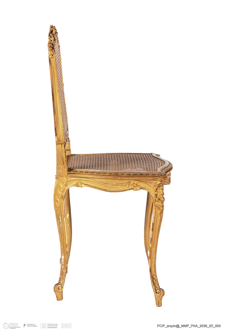 Matéria/Técnica: Madeira de (?); palhinha; folha de ouro; Cronologia: 1830 - 1852; Autoria: Desconhecida; Dimensões (cm): Altura: 90,0; Largura: 40,0; Profundidade: 40,0.