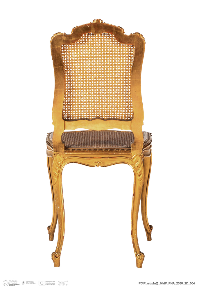 Matéria/Técnica: Madeira de (?); palhinha; folha de ouro; Cronologia: 1830 - 1852; Autoria: Desconhecida; Dimensões (cm): Altura: 90,0; Largura: 40,0; Profundidade: 40,0.