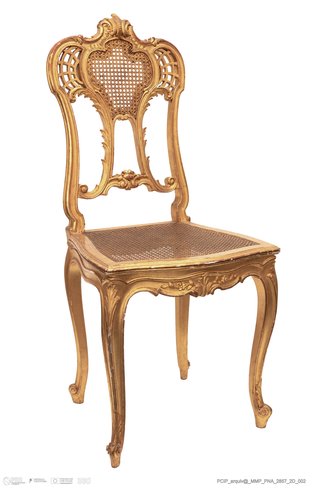 Matéria/Técnica: Madeira de (?); palhinha; folha de ouro; Cronologia: Século XIX; Autoria: Desconhecida; Dimensões (cm): Altura: 98,0; Largura: 43,5; Profundidade: 44,0.
