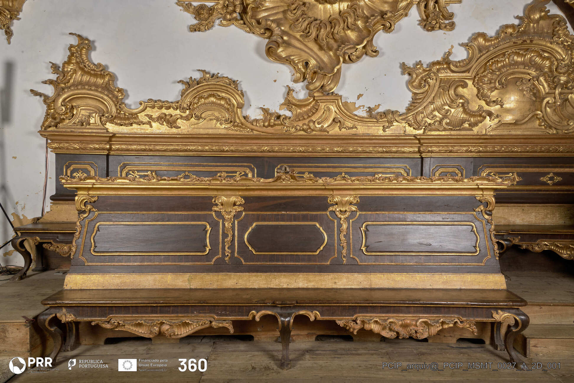 Matéria/Técnica: Madeira entalhada e dourada / Entalhamento e douramento; Cronologia: 1761 - 1764; Autoria: Frei José Santo António Vilaça; Dimensões (cm): 290 x 979 x 52 superior 148 x 865 x 54 inferior.