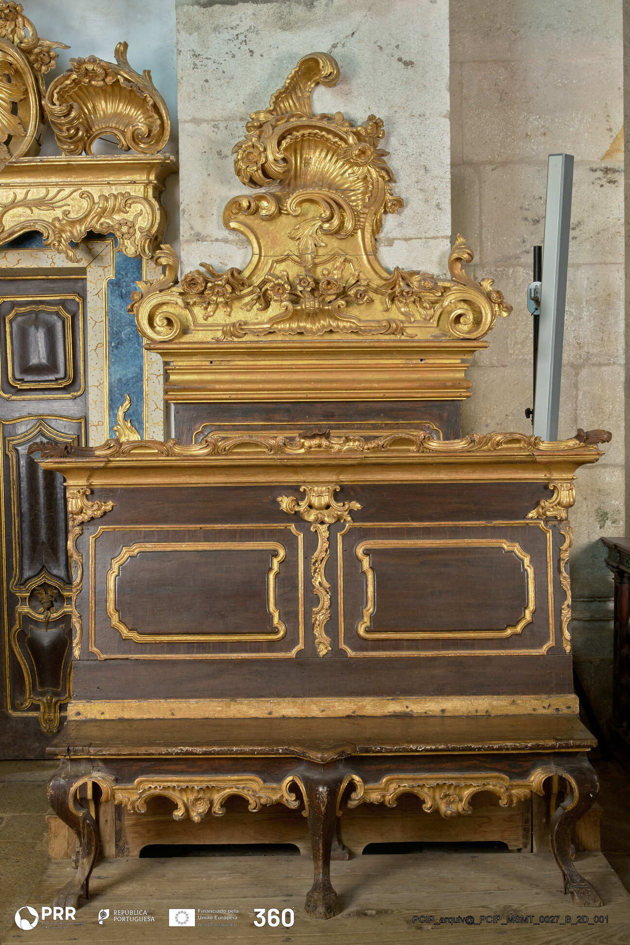 Matéria/Técnica: Madeira entalhada e dourada / Entalhamento e douramento; Cronologia: 1761 - 1764; Autoria: Frei José Santo António Vilaça; Dimensões (cm): 293 x 979 x 52 superior 148 x 865 x 54 inferior.
