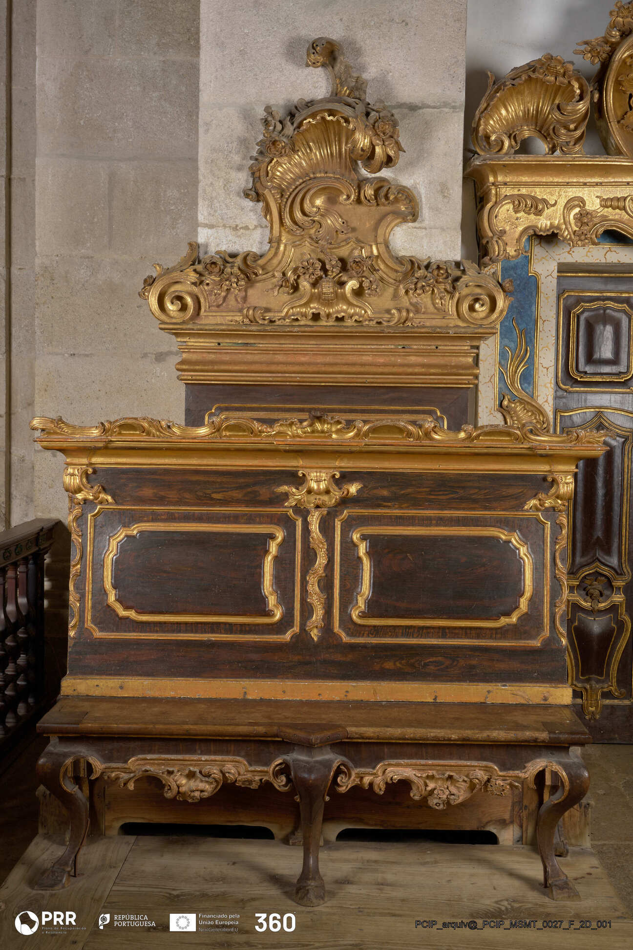 Matéria/Técnica: Madeira entalhada e dourada / Entalhamento e douramento; Cronologia: 1761 - 1764; Autoria: Frei José Santo António Vilaça; Dimensões (cm): 297 x 979 x 52 superior 148 x 865 x 54 inferior.