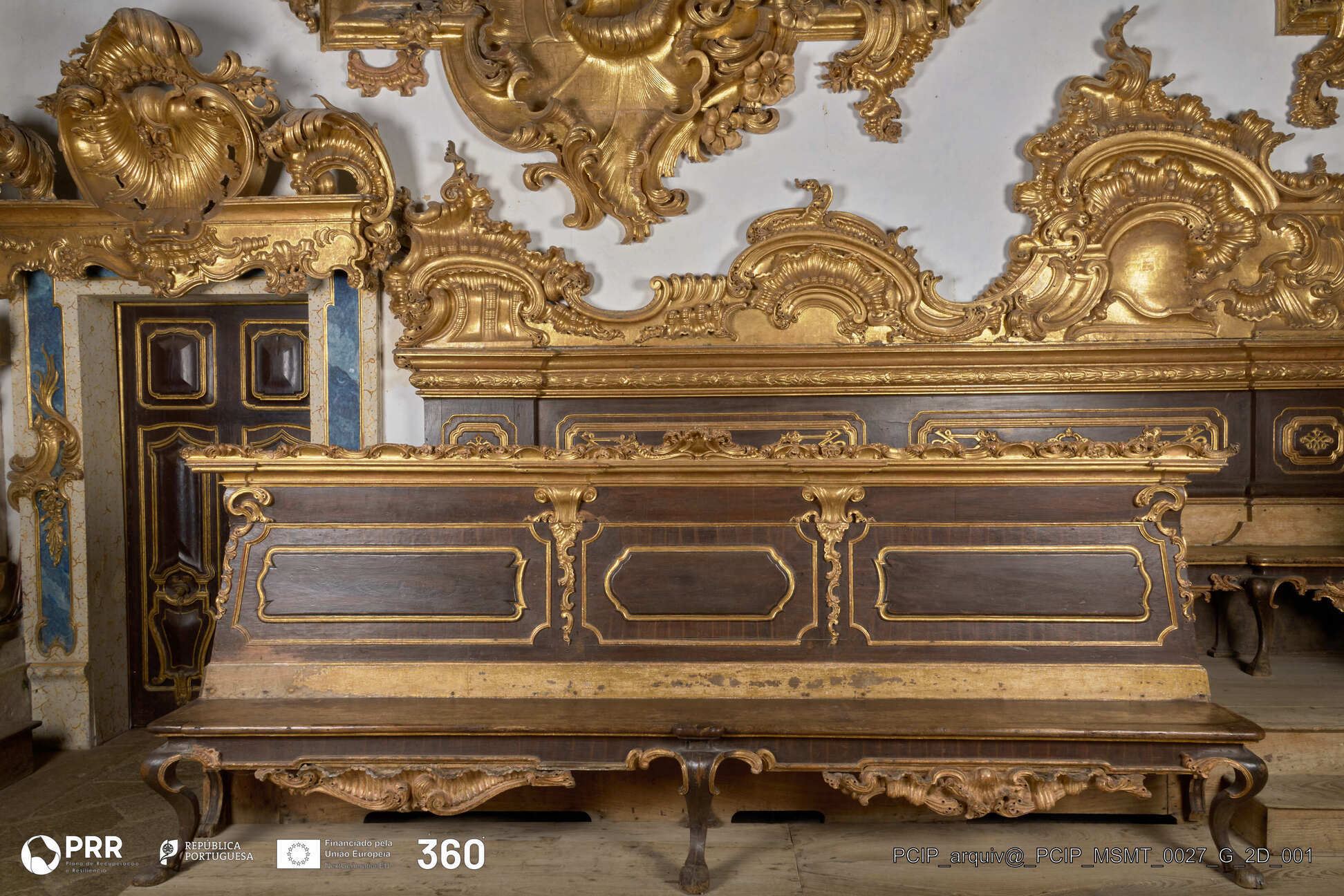 Matéria/Técnica: Madeira entalhada e dourada / Entalhamento e douramento; Cronologia: 1761 - 1764; Autoria: Frei José Santo António Vilaça; Dimensões (cm): 298 x 979 x 52 superior 148 x 865 x 54 inferior.