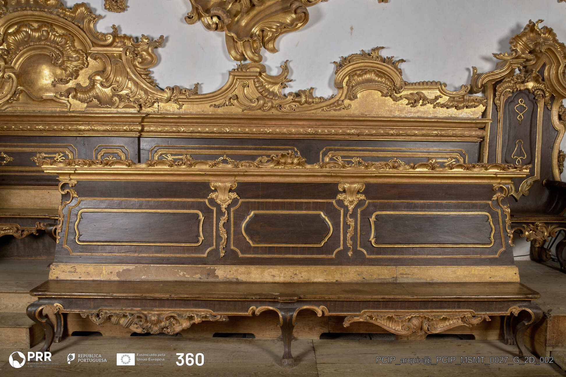 Matéria/Técnica: Madeira entalhada e dourada / Entalhamento e douramento; Cronologia: 1761 - 1764; Autoria: Frei José Santo António Vilaça; Dimensões (cm): 299 x 979 x 52 superior 148 x 865 x 54 inferior.