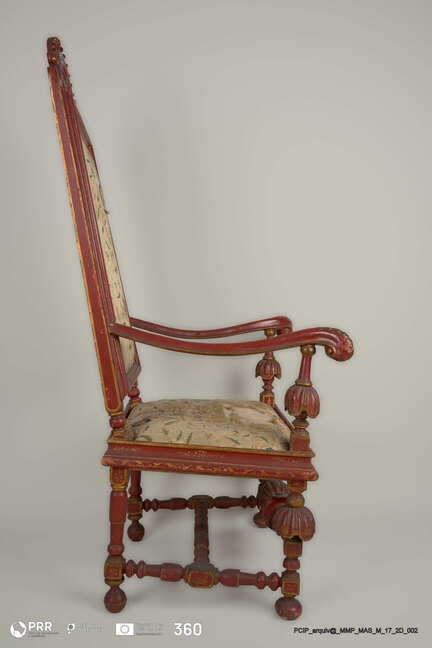 Matéria/Técnica: Madeira entalhada, torneada e policromada ( pintura acharoada ); seda bordada a sedas polícromas; Cronologia: Século XVIII; Autoria: Desconhecida; Dimensões (cm): Altura: 151; Largura: 68,5; Comprimento: 70,5.